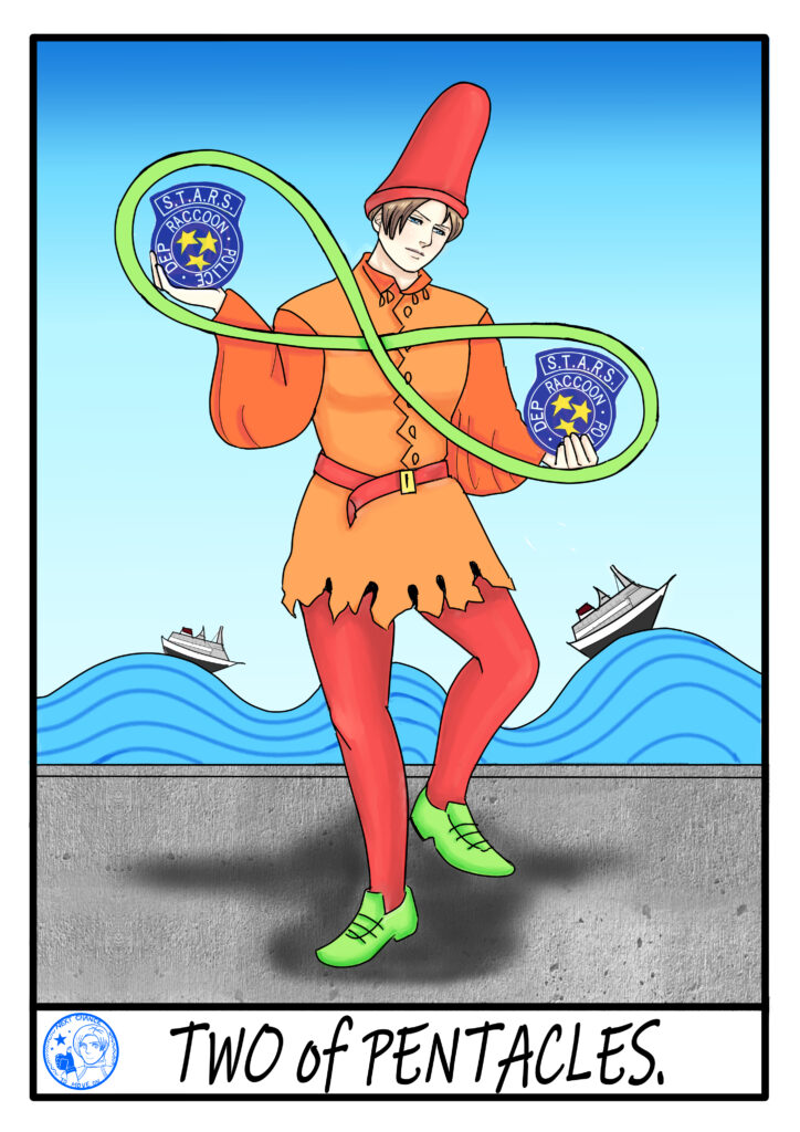 Leon holding two pentacles…In the original tarot card, a young man dressed like a jester is depicted balancing two pentacles in his hands, as if playfully juggling them.