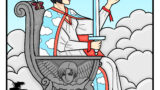 剣を持ち去るレオン…本物のタロットカードでも、悪知恵を働かせて…ほくそ笑んでいる男が、7本ある剣を敢えて2本だけその場に残し、5本奪って、その場からこっそり立ち去ろうとしている絵が印象的です。