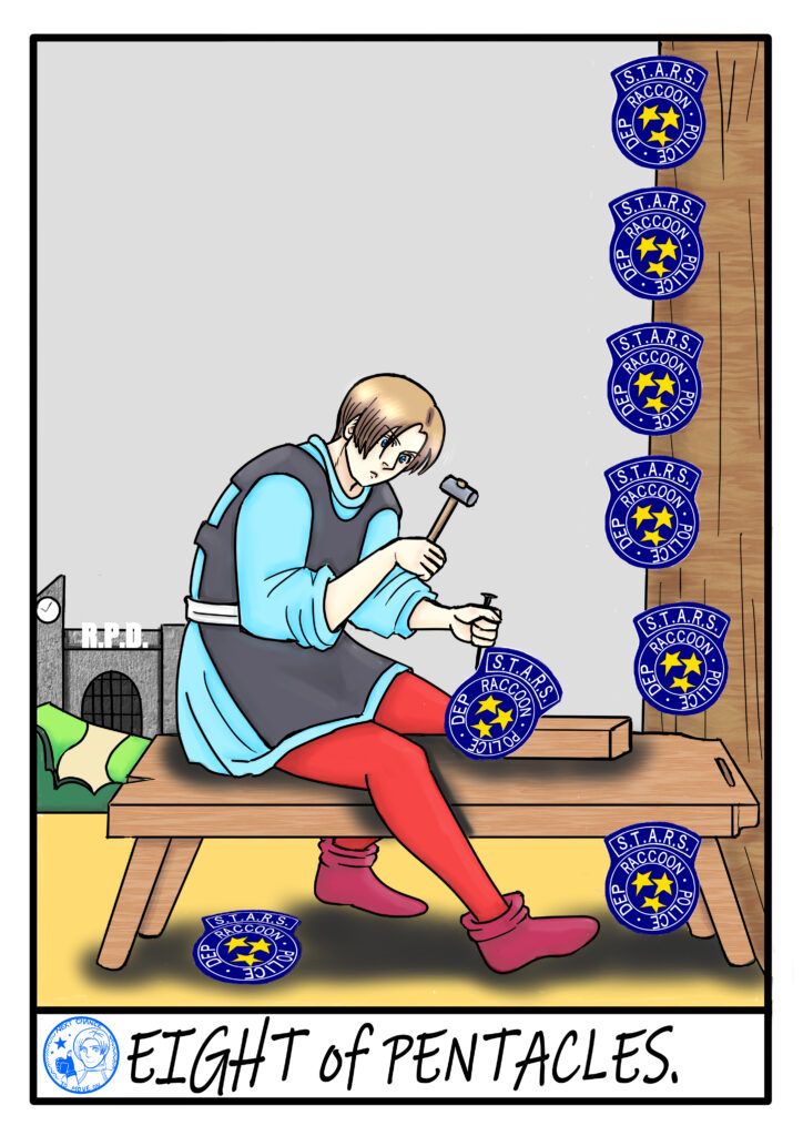 The eight pentacles displayed…They are the fruits of Leon’s efforts up to this point.