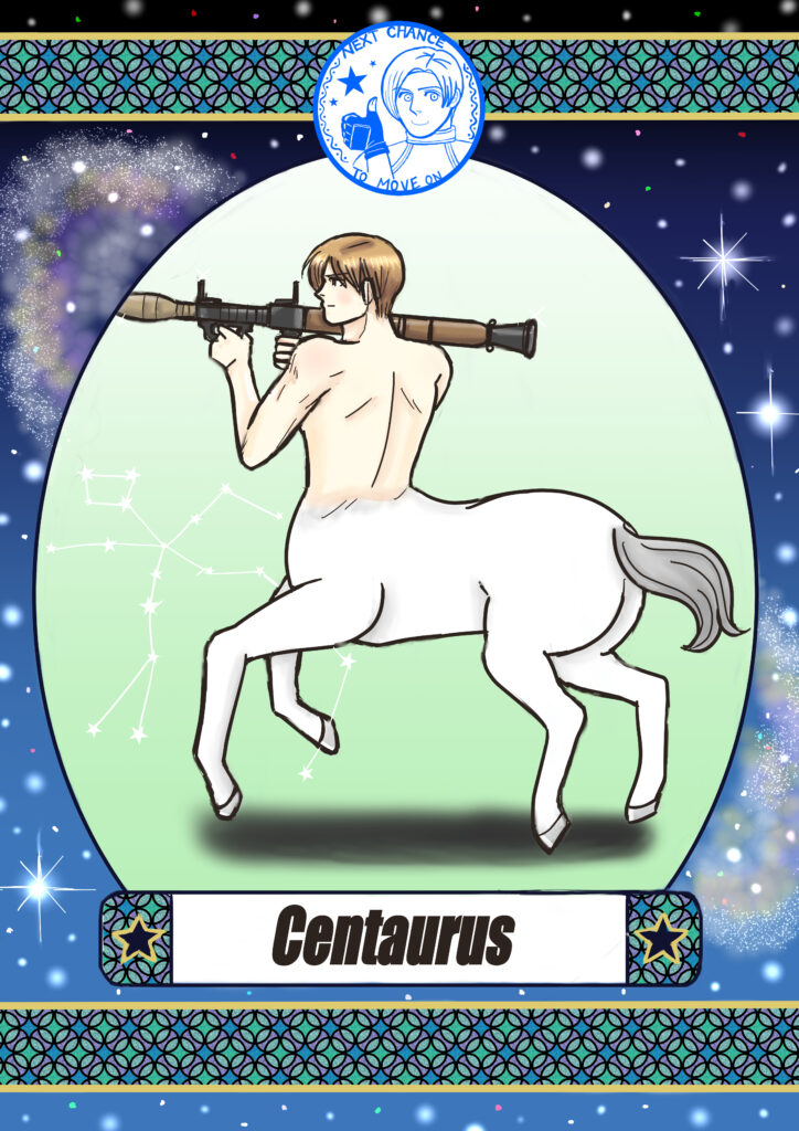 星図に描かれている「ケンタウルス座」は手に長い槍を持っていますが、レオンがモデルなのでロケットランチャーを持たせてみました💦