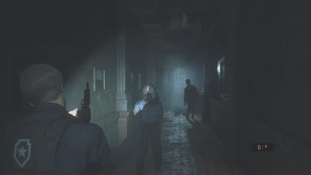さらに普通に階段を降りて来たゾンビもレオンに迫る‼